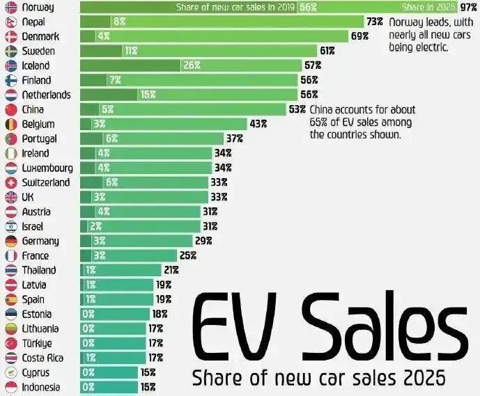 2025年的数据新鲜出炉,挪威销售新车中电动汽车占比达到了惊人的97%。