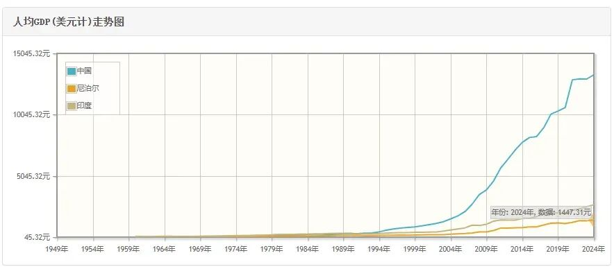 中国、印度、尼泊尔人均GDP对比